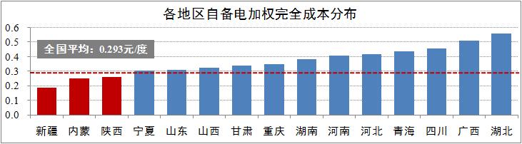 目前,全國共有40家電解鋁企業配有自用電廠,占全國電解鋁企業總數比重為39%,自備電產能占全國總產能的57%。作為電解鋁主要成本構成要素之一,現階段電力成本占據電解鋁成本的35%。綜合分析全國各地區自備電加權完全成本,截至今年3月份,僅有新疆、內蒙、陜西的加權完全成本低于0.293元/度的全國平均水平,其中新疆地區自備電成本為0.187元/度。從電解鋁廠完全成本上看,尚未投入使用自備電的電解鋁廠基本處于虧損運營行列,預計虧損面將隨著越來越多自備電的投入使用而逐步有所緩解。