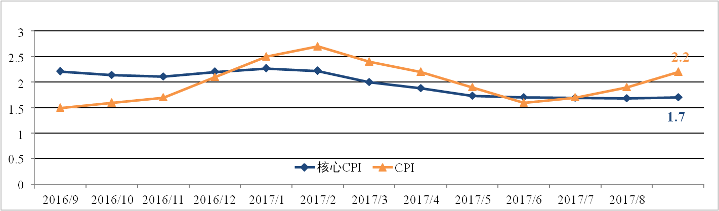 美國9月物價指數增速回升,但略低于市場預期。9月美國CPI為2.2%,較 上月擴大0.3個百分點,核心CPI為1.7%,與上月基本持平。颶風襲擊美國產 油區造成能源產能下降推高原油價格是CPI上漲的主要原因。