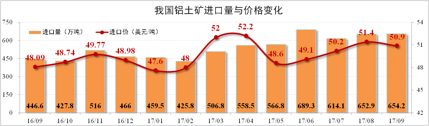 9月我國鋁土礦進口量達654.2萬噸,同比增長46.48%,環比增長0.2%。其中澳洲進口量達283萬噸創下歷史新高。鋁土礦進口價格微幅下降至50.9美元/噸,環比下降0.97%。