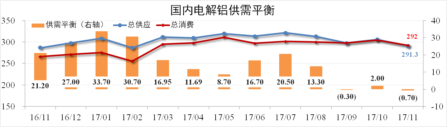 據阿拉丁數據,11月份我國電解鋁產量291萬噸,同比上漲1.43%,環比下跌4.8%。凈進口0.3萬噸,總供應量291.3萬噸,總消費量292萬噸,從靜態數據看,當月理論供應短缺0.7萬噸。