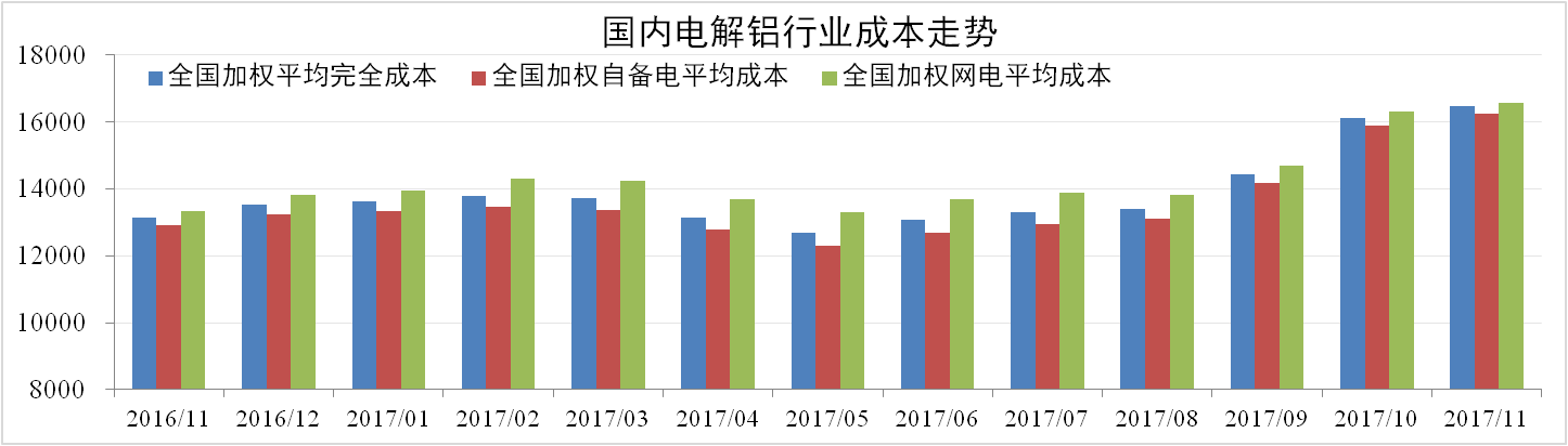 分析認為:氧化鋁行業減產后市場仍需時間消化過剩庫存,氧化鋁價格將持續走弱。電解鋁實際減產不及預期,陽極供應緊張價格堅挺,另外部分地區燃煤供暖回歸,煤炭價格大漲,綜合來看預計12月電解鋁成本仍會上漲。