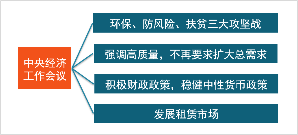 中央經濟工作會議12月18-20日在北京舉行,會議再次確定我國經濟已由高速增長階段轉向高質量發展階段,并為我國2018年經濟工作定下方向和基調。預計明年貨幣供應偏緊,信貸低增速成為常態,GDP增速將放緩至6.5%左右。而由于財政政策積極,加上多主體地產供應體系的構建,租賃用地建設以及棚戶區改造將支撐2018年房地產投資增速好于預期。