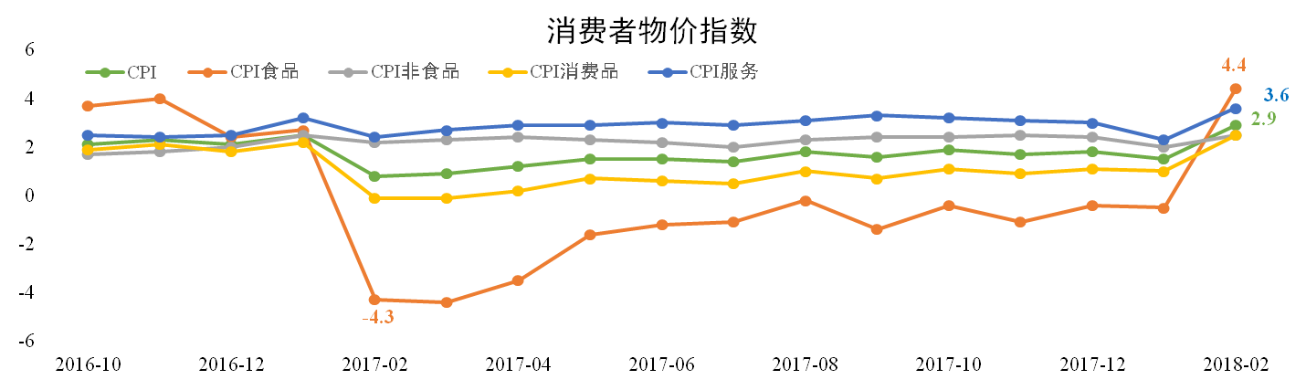 受春節(jié)錯位影響,食品價格同比大幅上升,拉動CPI上揚。據(jù)統(tǒng)計局數(shù)據(jù),2月份我國CPI同比為2.9%,較上月擴大1.4個百分點,為2013年11月以來的最高值。主要分項均有不同程度上漲,其中食品同比上漲4.4%。