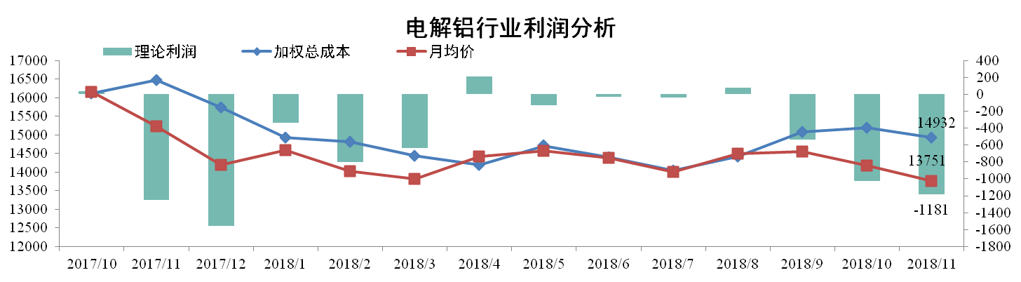 11月份電解鋁行業加權平均成本為14932元/噸,環比上升0.78%。同期國內現貨均價報13751元/噸,環比下降2.98%。行業理論利潤為虧損1181元/噸。